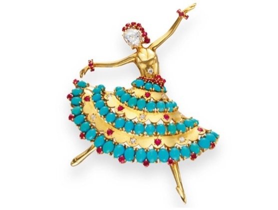The years after World War II were connected to a huge need of rebirth. The recovery took place in jewellery as well. Used throughout the day, depicting positive motifs with a contemporary naturalistic inspiration, such as flowers, ribbons, animals and ballerinas, Van Cleef and Arpels excelled in the production of brooches.